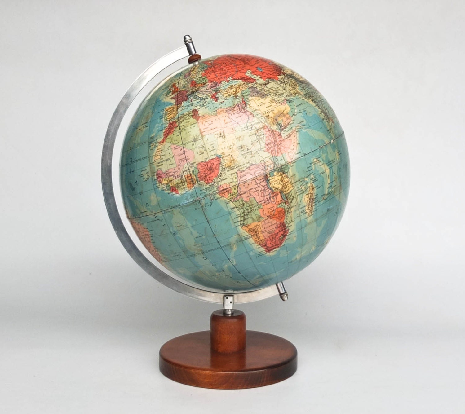 A beautiful vintage world globe from 70's Germany. It has a metallic hand and wooden base . The globe itself is made of plastic and paper with German writing and beautiful colors. Of course, these items are incredibly stylish and a wonderfully nostalgic reminders of times passed.
