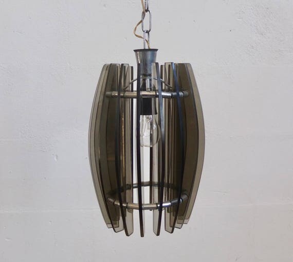 Amazing mid century modern three bulb chandelier presumably made by Veca - Fontana Arte in 60s - 70s Italy. It's made of chrome base and thick smoked glass plates. This ceiling light has a cool, abstract shape which adds a awesome feel to your space. Definitely a stylish item to have.