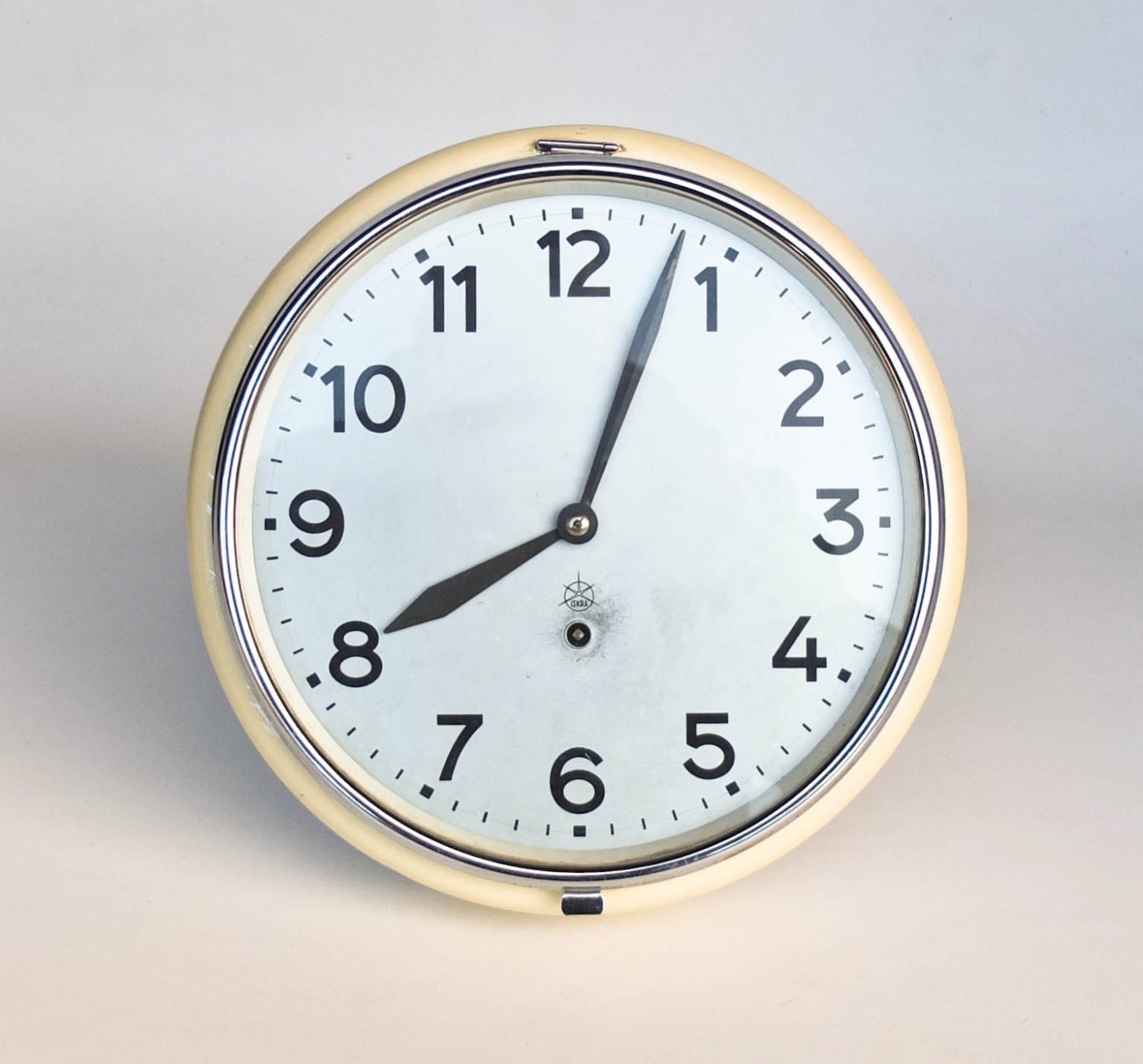 A beautiful industrial wall clock with a really efficient and complex mechanism made by Iskra somewhere in 1950's or 60's. Those clocks used to hang in schools, hospitals and factories around Yugoslavia. A few turns of the key and it works for several days. It is quite large and impressive when hung on a wall and indeed a very popular item for collectors and interior designers. As you can imagine, it displays beautifully in an industrial studio office or home.
