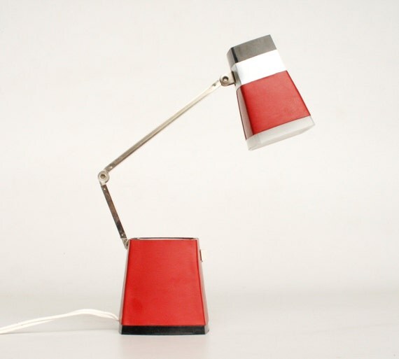 Original Taki Light Iris TL-84 produced by Tada Kiko in 60's Japan. Lamp is fully adjustable and can be used as a desk or wall lamp by using a folding hanger on the bottom. It has two light powers and can be folded into the pyramid for even more discrete lighting. Most surface of the lamp is covered with red leather which makes this lamp truly unique besides it's techie design.